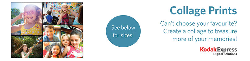 Printing a collage from all of your favourite photos is another way to cherish your memories. Design your own unique collage in store or online using our simple easy to use platform because special moments deserve more than just one photo. We offer a wide range of sizes and designs for your collage prints ranging from a small 5x7 inches to a massive 72x24 inches. These collage also make a perfect present for friends or family. Whilst designing the collage you can also add personalised text, change backgrounds, add borders or themes.
