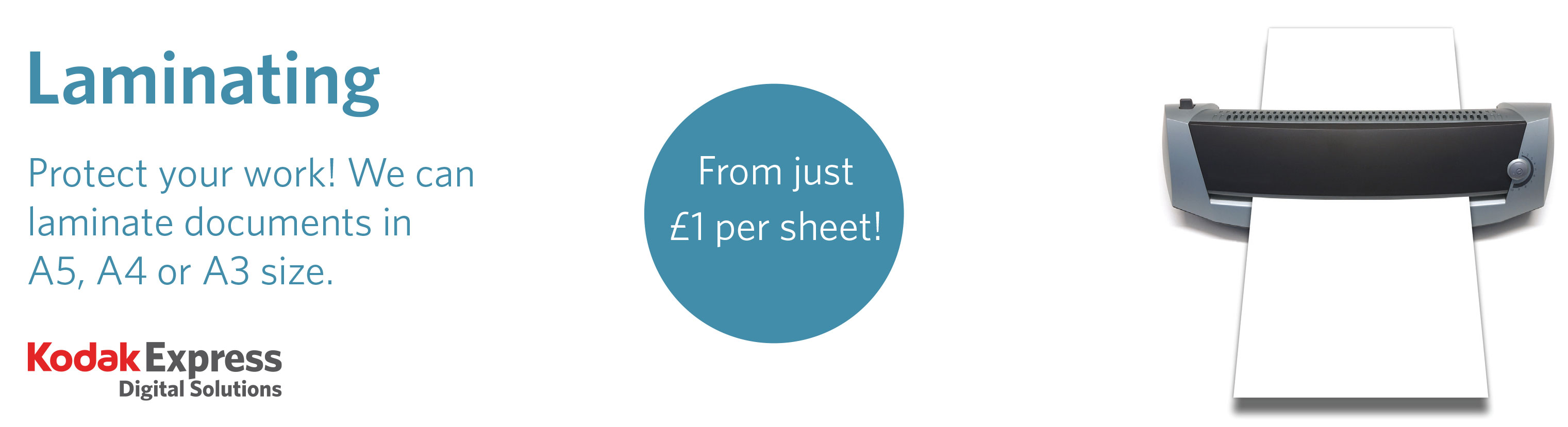 Laminating Prices Size / Quantity 1 to 5 6+ A5 £1.50 £1 A4 £2.00 £1.50 A3 £2.50 £2.00